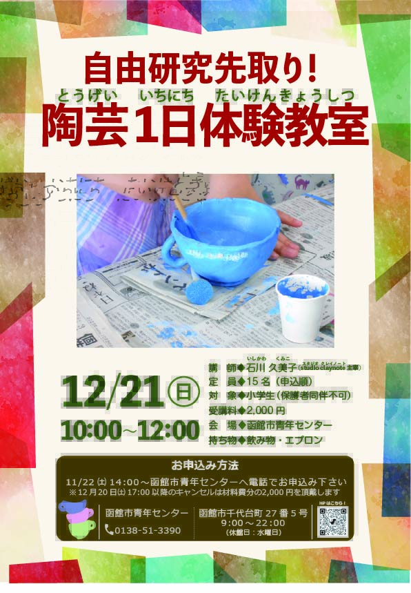 【11/22(土)14時から電話受付】自由研究先取り!陶芸1日体験教室