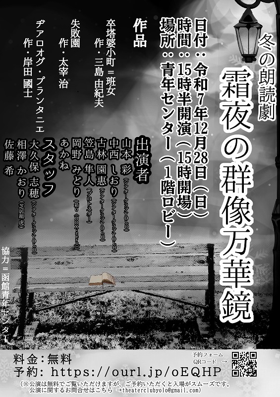 12月28日(日) 青年センターで開催される、冬の朗読劇「霜夜の群像万華鏡」のお知らせです。