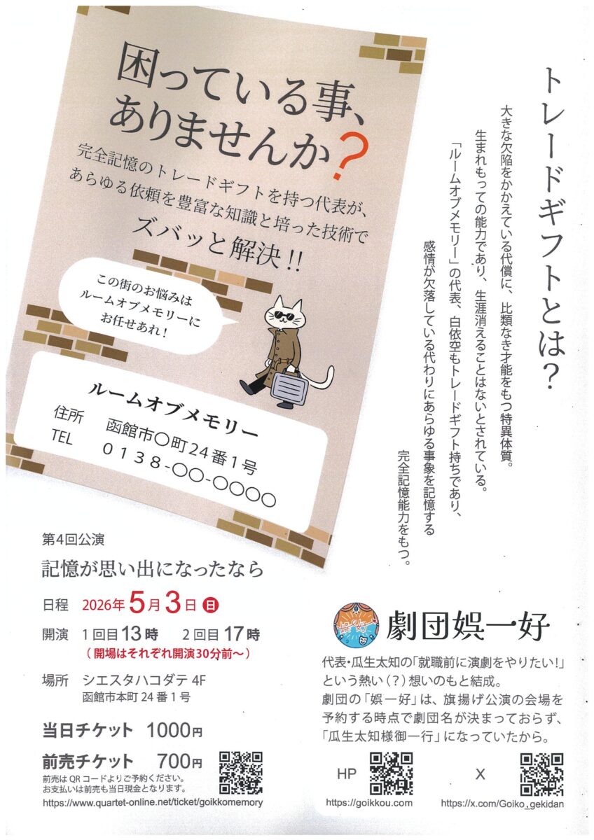 第四回公演「記憶が思い出になったなら」公演のお知らせです。